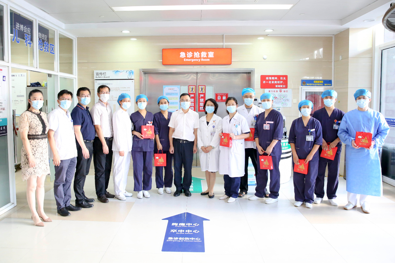 区领导一行先后来到急诊预检台、急诊诊室、急诊抢救室和发热门诊等场所,与坚守岗位的医务人员亲切交谈,详细了解节日期间病患救治及一线医务人员工作情况,并送上中秋祝福和慰问品。陈宇剑书记代表区委、区政府感谢医务人员在疫情防控期间做出的巨大贡献,勉励大家继续做好相关工作,筑牢安全防线,为人民健康和城市安全保驾护航;同时也嘱咐医务人员要做好自身防护与劳逸结合,确保自身健康。