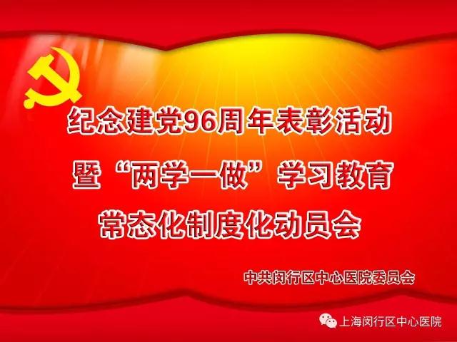 2017年6月27日,闵行区中心医院党委隆重举行纪念建党96周年表彰活动暨“两学一做”学习教育常态化制度化动员会,特邀区卫计委党委书记黄陶承为全体党员上党课。闵中心党政领导班子成员、中层干部和全体党员出席大会,表彰大会由闵中心党委副书记、纪委书记庄玉忠主持。