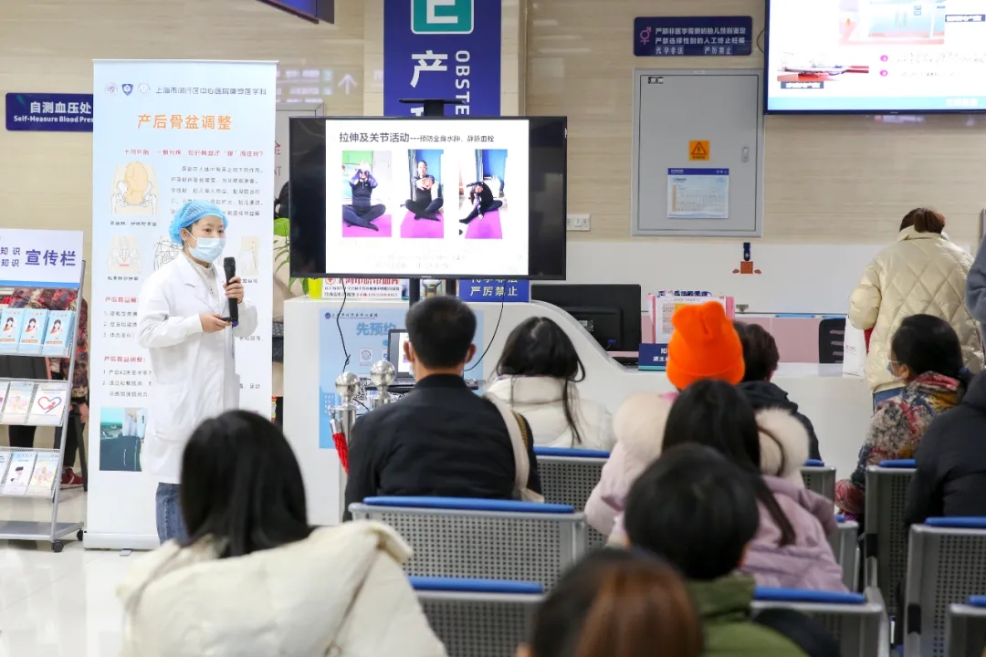 康复科医师志愿者在门诊妇产科候诊区,为广大患者及家属开展以产后康复为主题的健康知识科普,教授患者正确认识产后康复的重要性、如何进行产后盆底训练等。