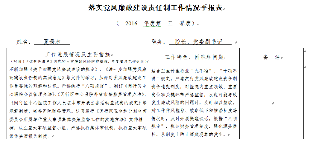 夏景林同志落实党风廉政建设责任制工作季报表(2016年第三季度)