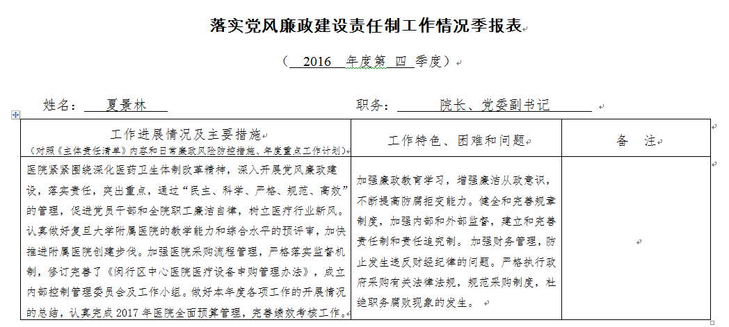夏景林同志落实党风廉政建设责任制工作季报表(2016年第四季度)