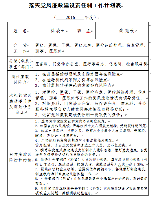 徐凌云同志落实党风廉政建设责任制工作计划表(2016年度)
