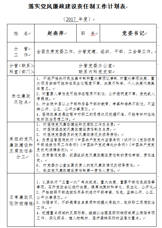 赵燕萍同志落实党风廉政建设责任制工作计划表(2017年度)