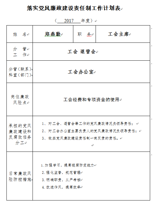 郑燕勤同志落实党风廉政建设责任制工作计划表(2017年度)