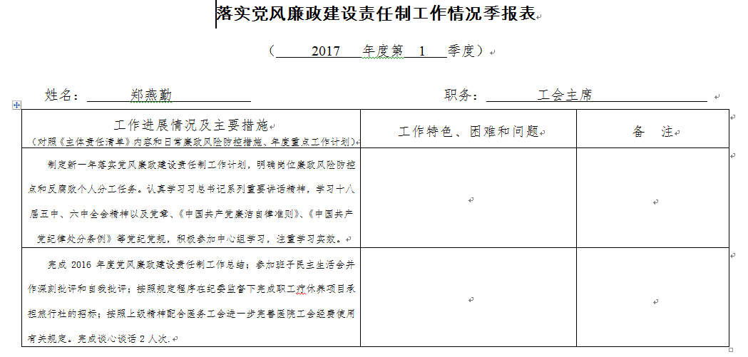 郑燕勤同志落实党风廉政建设责任制工作季报表(2017年第一季度)