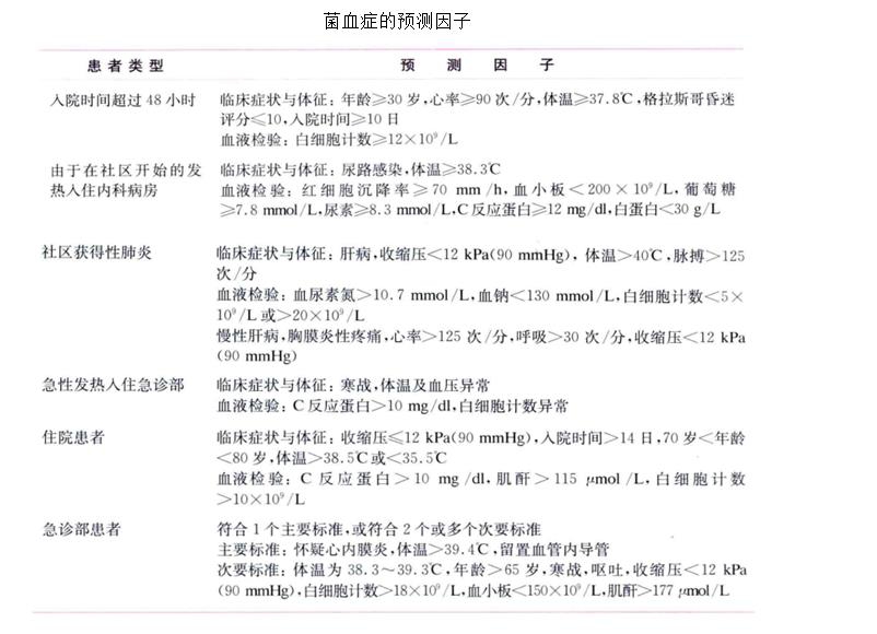 菌血症的独立预测因子见表下表,列出血培养的一些患者组群或情况:ICU患者出现再次发烧;中性粒细胞减少和严重免疫缺陷(包括移植、CD4细胞减少到200/ul以下时的艾滋病病毒感染、使用糖皮质激素或其他免疫抑制剂、血液系统肿瘤或脾脏切除),以及所有入院的脓毒血症患者尤其是严重脓毒血症和脓毒血症休克。